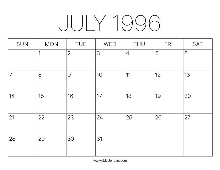 Download this 1996 calendar for July and use it to find out whether a specific date fell on the weekend or during the workweek. This printable monthly calendar list all the days of July 1996 in a simple PDF template. Paper size: US Letter. Document width and height: 11 by 8.5 inches.