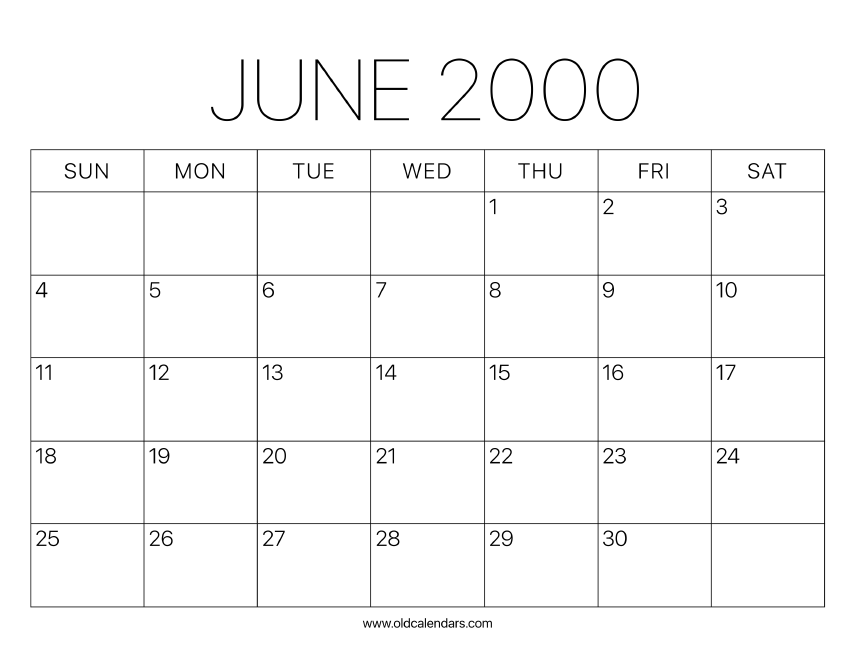 Download this 2000 calendar for June and use it to find out whether a specific date fell on the weekend or during the workweek. This printable monthly calendar list all the days of June 2000 in a simple PDF template. Paper size: US Letter. Document width and height: 11 by 8.5 inches.